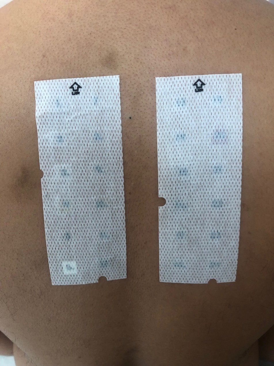 על המדבקות נמצאים החומרים הנבדקים. הם נשארות על הגב 48 שעות. מורידים את המדבקות ובודקים אם יש תגובה לחומרים השונים.